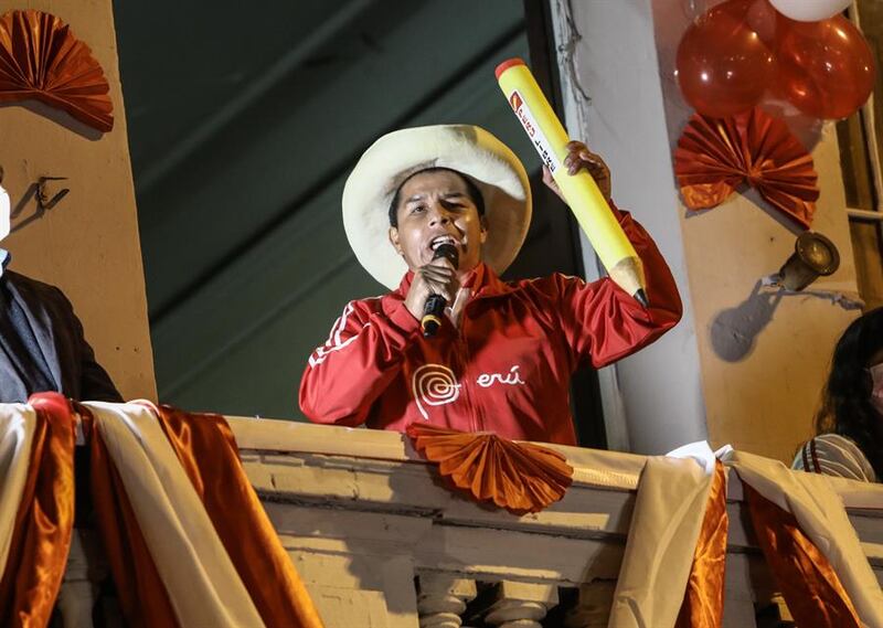 El profesor izquierdista -casi un desconocido al inicio de la campaña- presidió un mitin de cierre de campaña desde el balcón de la sede de la Confederación General de Trabajadores del Perú (CGTP), la mayor central sindical del país, en la plaza Dos de Mayo de Lima.