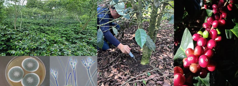 En la finca “La Barranca” ubicada en Jilotepec, Veracruz, se inoculó (Figura 1c) durante un año (cada dos meses) una cepa de hongo solubilizador de fosfato (Penicillium sp.) en un grupo de plantas de café, se aplicaron 1x10¹² esporas por planta. Esta estrategia busca mejorar la fertilidad del suelo sin recurrir exclusivamente a fertilizantes químicos, contribuyendo así a una producción de café más ecológica y rentable.