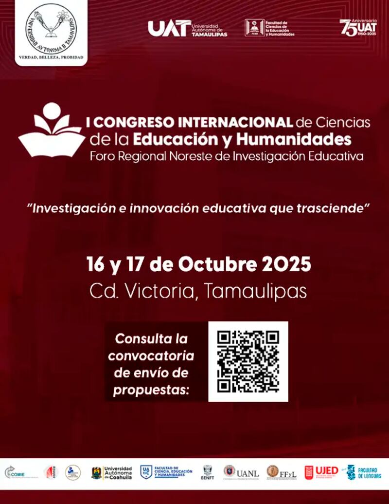 Con el objetivo de generar un espacio de diálogo y reflexión sobre los avances, desafíos y propuestas en el ámbito educativo y humanístico, la Universidad Autónoma de Tamaulipas, junto con diversas universidades e instituciones aliadas, convocan al I Congreso Internacional de Ciencias de la Educación y Humanidades y al Foro Regional Noreste de Investigación Educativa, que se celebrarán los días 15, 16 y 17 de octubre de 2025 en modalidad híbrida.