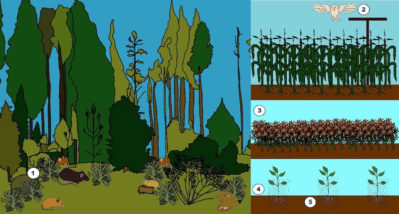 El manejo de los roedores comensales es más complejo en los campos agrícolas, por sus características de extensión y numerosos refugios que pueden ofrecer. Asimismo, la presencia de especies nativas que se convierten en plaga complica el manejo desde un punto de vista ecológico. Los roedores nativos y comensales se pueden reproducir al grado de convertirse en plaga cuando existe un exceso de alimento, en este caso, forma de cultivos agrícolas. Así como los humanos disfrutamos de los beneficios nutricionales que nos brindan los cultivos como el maíz, el arroz, y el trigo, los roedores también pueden explorar este tipo de alimentos que son ricos en carbohidratos. Otros cultivos como la papa o el camote, además de proveer carbohidratos son una fuente de agua. Los cultivos de caña de azúcar también se ven afectados por los roedores, ya que el azúcar es una fuente de energía muy atractiva. Además, las condiciones asociadas con un cultivo de temporal exitoso, que en general incluyen lluvias y temperaturas cálidas, favorecen a la reproducción rápida de los roedores. Sin embargo, existen opciones de manejo que se emplean frecuentemente. La principal estrategia de prevención es mantener los hábitats de los roedores nativos en buen estado, con una amplia diversidad de especies vegetales. A la par, se debe modificar el paisaje agrícola para hacerlo menos habitable para los roedores, por ejemplo, limpiar la maleza en los cultivos puede disminuir los espacios de refugio para los roedores. Aunque los roedores pueden alimentarse de una gran variedad de plantas, existen especies vegetales con aromas fuertes o tóxicas como la menta, la salvia, la ruda, la pimienta, la cebolla o el cempasúchil que les resultan aversivos y se pueden plantar como repelentes de roedores. Existen numerosas opciones de plantas repelentes, sin embargo, se debe tomar en cuenta el ciclo de vida de estas plantas para que coincida con el ciclo de los cultivos que se pretende proteger. En el caso de cultivos frutícolas, se puede optar por la aplicación de mallas alrededor de las plantas jóvenes y sus raíces. Finalmente, se puede recurrir a la ayuda de los depredadores naturales de os roedores, como las aves de presa que incluyen a los halcones, águilas y lechuzas. Estas especies se pueden atraer a lo cultivos mediante la instalación de perchas o de cajas nido en la cercanía de las parcelas. Las aves de presa, además de controlar a los roedores directamente a través de la depredación, mantienen territorios que los roedores evitan, por lo que tener un depredador residente puede alejar a los roedores de los cultivos.