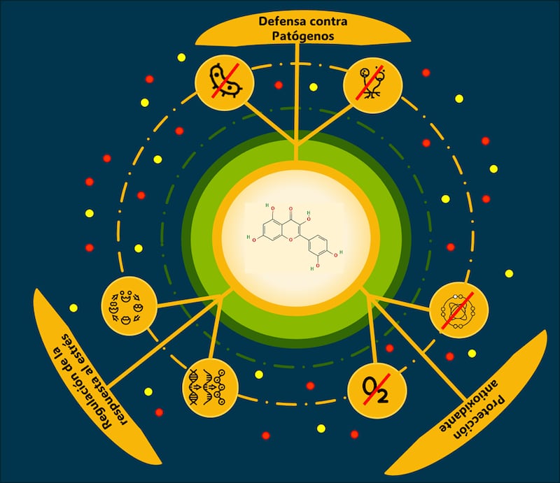 La quercetina es un metabolito especializado que juega un papel clave en la defensa vegetal y también tiene beneficios para la salud humana. Su capacidad para neutralizar radicales libres e inhibir el crecimiento de microorganismos patógenos la convierte en un compuesto valioso para las plantas, adicional a su potencial para reducir la inflamación y prevenir ciertas enfermedades, lo que la hace importante para el ser humano.
