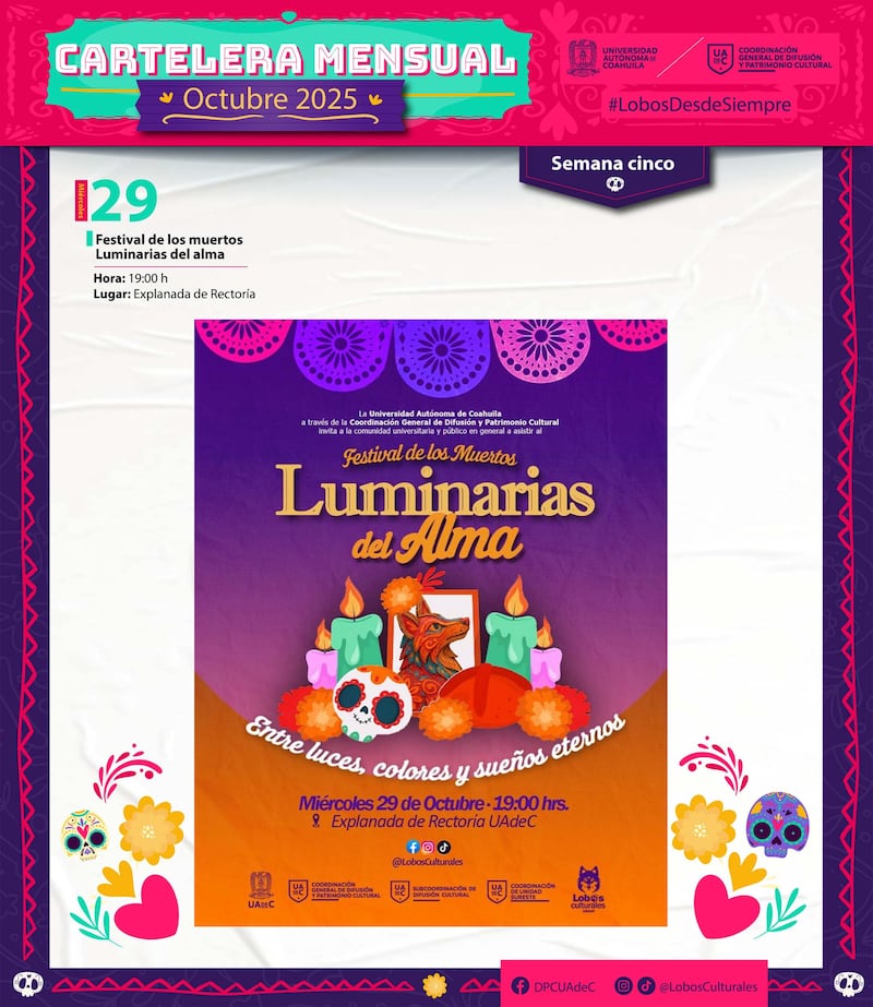 La Universidad Autónoma de Coahuila (UAdeC), a través de la Coordinación General de Difusión y Patrimonio Cultural (DPC), anunció una amplia agenda de actividades artísticas y formativas que se llevarán a cabo durante el mes de octubre, con el propósito de fortalecer la participación cultural de la comunidad universitaria y del público en general en las Unidades Sureste, Norte y Laguna.