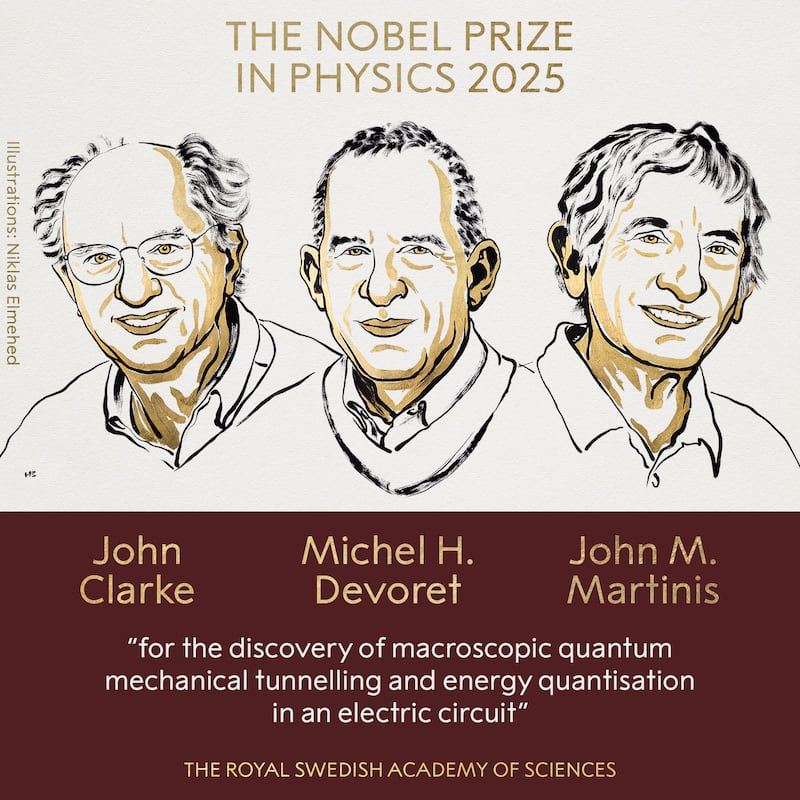 El Premio Nobel de Física 2025 fue otorgado el martes a John Clarke, Michel H. Devoret y John M. Martinis por el descubrimiento del efecto túnel mecánico cuántico macroscópico y la cuantificación de la energía en un circuito eléctrico, anunció la Real Academia Sueca de Ciencias.