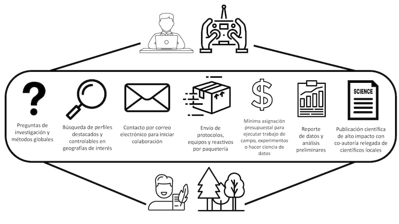 Recientemente nombramos y describimos una nueva expresión de neocolonialismo científico en ecología que, hasta ahora, no había sido directamente evidenciada ni problematizada debido a que opera de manera más sutil, y suele pasar desapercibida alrededor del mundo. Nos referimos a la ciencia por control remoto. En este modelo, investigadores e investigadoras ni siquiera necesitan viajar a las regiones de estudio para supervisar el trabajo de campo y evidenciar sus prácticas extractivas. Utilizando herramientas digitales y mecanismos a distancia (e.g., correos electrónicos, videoconferencias, envíos por paquetería), mantienen el control total sobre las preguntas de investigación, métodos, análisis, recursos financieros y la publicación de los resultados (Fig. 1). De hecho, los proyectos suelen estar ya completamente diseñados antes de involucrar a colaboradores y colaboradoras locales, quienes, a pesar de ser responsables del trabajo de campo y poseer un conocimiento contextual invaluable, suelen recibir recursos mínimos (cuando disponibles) y ocupar posiciones marginales en las redes de coautoría científica.