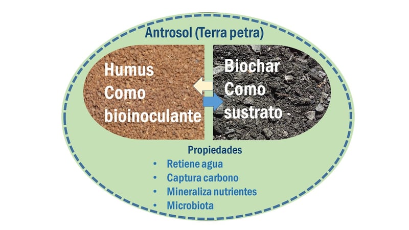 Gracias a sus propiedades, el biochar se ha posicionado como un material que podría ser clave para la recuperación a largo plazo de suelos degradados: específicamente, su aplicación junto con biofertilizantes (ej. vermicomposta o humus de lombriz). Se ha reportado que puede mejorar la retención de agua y nutrientes (incluso administrar su suministro); mejorar la estructura del suelo; incrementar la cantidad de microorganismos benéficos; reducir la biodisponibilidad de distintos agentes contaminantes (ej. metales pesados); entre otros posibles beneficios. Al final, todo esto se puede traducir en cultivos con mayor calidad y mayor resiliencia (7, 8, 9). Y como pilón o coitán, su aplicación implica la introducción de carbono estable en el suelo, lo cual nunca sobra, ya que el cambio climático igual está a la orden del día. Aún se necesitan más estudios para conocer el alcance y los riesgos que puede tener la aplicación de biochar en el suelo; sin embargo, los resultados que se tienen hasta ahora son alentadores (Figura 2).