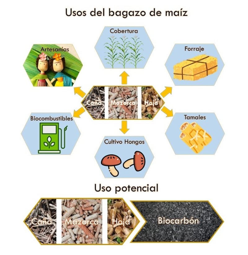 El rastrojo de maíz generalmente consiste en las cañas (tallo), espigas (inflorescencias masculinas), los oloteso mazorcas (inflorescencias femeninas) y el totomoxtle (hojas o brácteas que cubren la mazorca) que quedan después de la cosecha de los granos del maíz; estos son residuos orgánicos constituidos en un alto porcentaje por celulosa (una molécula muy grande), lo que se traduce en un tipo de residuo muy resistente (o recalcitrante) (2). Si bien no se tiene un número exacto y los rendimientos dependen del tipo de maíz que se cultive (ej. si es híbrido o criollo), además de las condiciones ambientales en donde se cultivan, generalmente se considera que el rastrojo representa el 50% de la biomasa aérea del maíz (3) y se estima que en México se producen aproximadamente 21-25 millones de toneladas de rastrojo de maíz (4). Este es aprovechado de diversas maneras por los productores: como forraje (principalmente), cobertura de suelos (mantillo), el totomoxtle – totomostle, totomochtle, totomochtli o totomoite - se vende para cocinar tamales; incluso tiene cada vez más demanda para el cultivo de hongos comestibles, biocombustibles y artesanías; y un pequeño porcentaje, directamente se quema (5,6). Otra opción de aprovechamiento, sobre todo para el olote que queda tras tu esquite, es la producción de biocarbón o biochar (Figura 1).