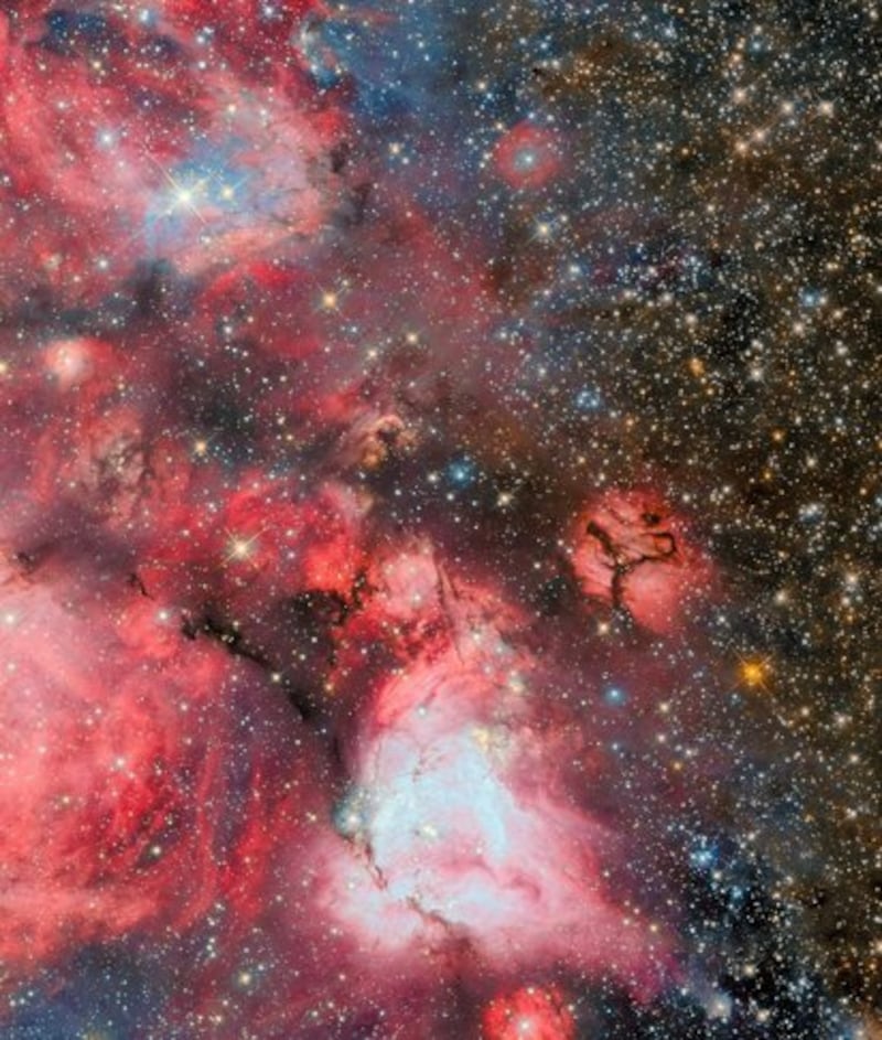 Aunque algunas de las estrellas brillantes en la nube parecen estar cubiertas de gas rojizo, otras parecen estar en el centro de una burbuja rojiza, a través de la cual se ve el fondo oscuro del espacio.