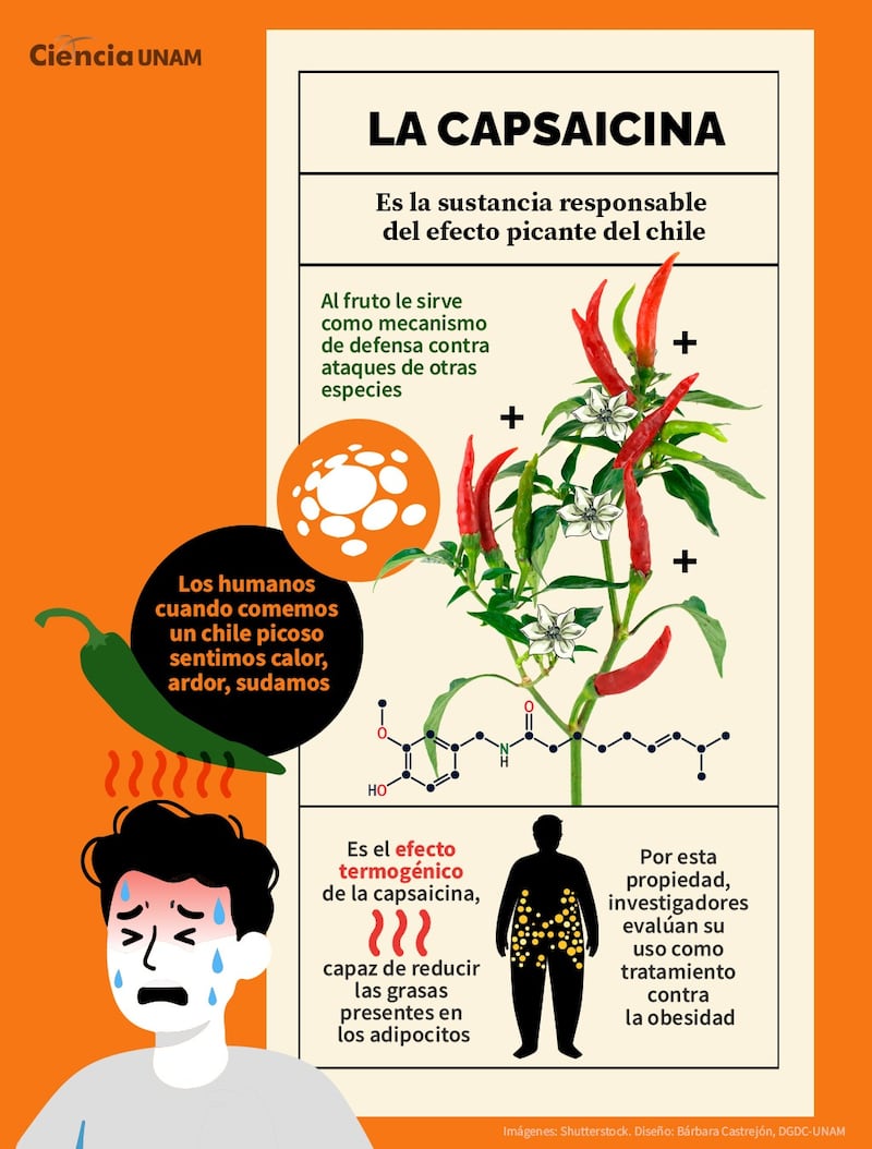 “Cuando uno come mucho chile empieza a sentir calor, que suda, eso es el efecto termogénico y se produce porque el cuerpo empieza a degradar grasas y esa degradación se convierte en calor y por eso sentimos calor cuando consumimos picante”.