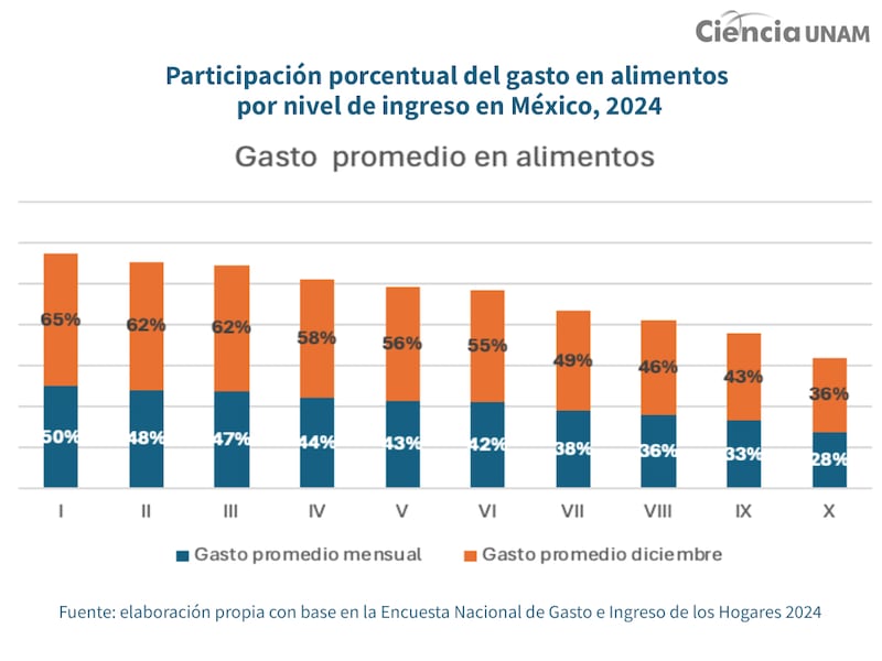 Durante la temporada decembrina, diversos estudios estiman que el gasto en alimentos aumenta cerca de 30% en comparación con el resto del año. Este incremento puede llevar a que los hogares más pobres destinen hasta 65% de su presupuesto total a la compra de alimentos, mientras que los hogares de mayores ingresos alcanzan alrededor del 36%. Para muchas familias, este aumento significa sacrificar otros rubros esenciales, como la vivienda, el transporte o los servicios de salud. No es raro que algunos recurran al endeudamiento temporal para solventar los gastos festivos.