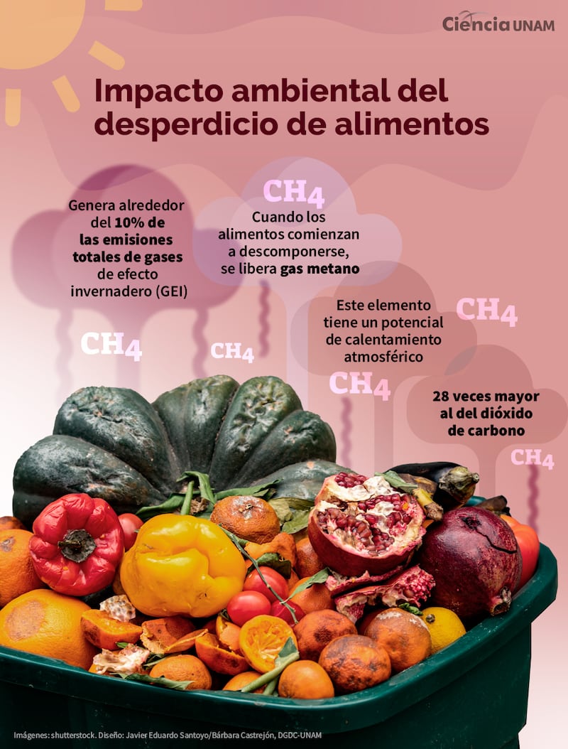 Cuando los alimentos comienzan a descomponerse, se libera gas metano, el cual tiene un potencial de calentamiento 28 veces mayor al del dióxido de carbono. Ambos gases intensifican el efecto invernadero, y son los que han provocado el aumento de la temperatura del planeta.
