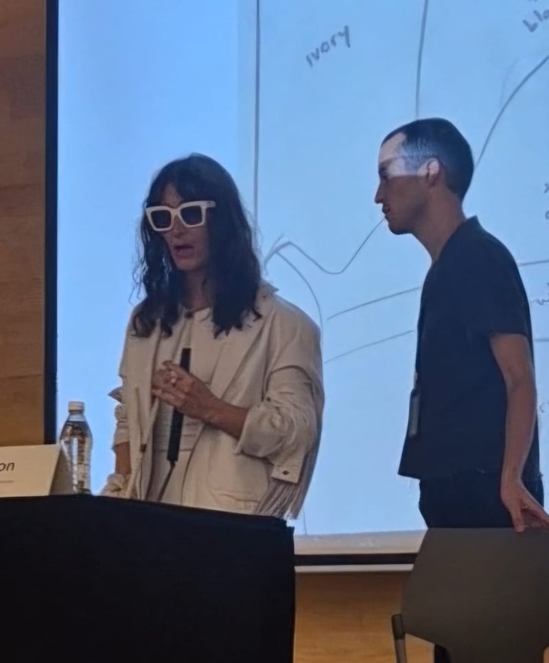Sube al escenario del auditorio del Museo Tamayo Arte Contemporáneo completamente vestida de blanco, en combinación con el marco, también blanco, de sus lentes oscuros, y con un bastón dobladizo, que guarda fácilmente en cuanto se instala en la mesa.