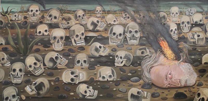 Mural inspirado en la plataforma monumental Huey Tzompantli (“andamio de cráneos”), que fue hallada hace una década a escasos metros del Colegio de San Hildefonso, y en la cual los mexicas exhibían los cráneos de personas sacrificadas en el Templo Mayor como ofrenda a Huitzilopochtli, dios de la guerra. Con esta pieza Gustavo Monroy traza un paralelismo histórico-cultural entre el México prehispánico y el actual, y alude al contexto de violencia, feminicidios, desapariciones y fosas clandestinas que desde hace años padece el país. Ahora bien, en sentido inverso, es un canto pictórico por la vida que clama, a un mismo tiempo, por la justicia y la diversidad.