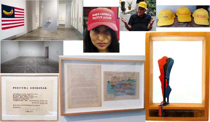 En Labor Camnitzer presenta Pintura Original, 1973, donde tensa, materialidad, ejecución y originalidad en el arte; Una que Cubre la Palabra que la Nombra, 1973-76, donde un escurrimiento de pintura cubre la palabra que completa esta frase, aludiendo a la parcialidad del lenguaje o en Canales, 1980, interviene un Mapa Mundí con hipotéticos Canales de Panamá por todo el mundo, reflexionando esto críticamente en el texto adjunto. La gorra roja de Make America Great Again ha sido subvertida como en Make America Native Again, giro retomado por Camnitzer en la inauguración al regalar 3 gorras amarillas con frases como Oligarchs, In Dignity We Trust o fusionando el índice Standard & Poor’s 500 y Trump.