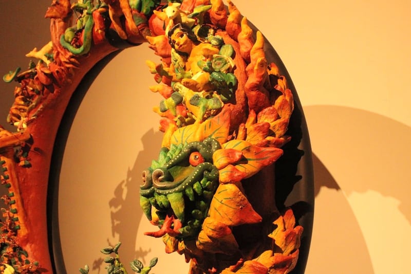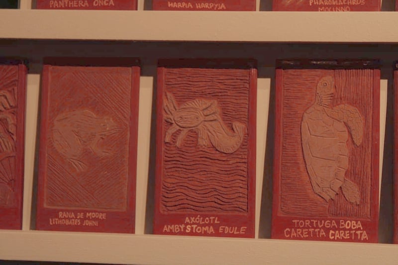 Exponentes lucían con orgullo su trabajo platicando con los asistentes sobre sus piezas, tal es el caso de Ángel Santos y Alberto Peredo con su artesanía “Animalia/Especies en Riesgo” donde con una técnica mixta de barro bruñido y madera policromada, hablan sobre la concientización de cuidar las especies mexicana, ya que algunas se encuentran en peligro de extinción o lamentablemente ya se extinguieron.