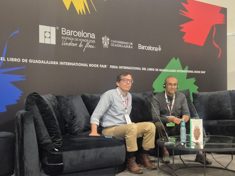 Ahora está sentado junto a Tomás Granados, editor y fundador de la editorial Grano de Sal, frente a los medios de comunicación que cubren la 39° Feria Internacional del Libro de Guadalajara.