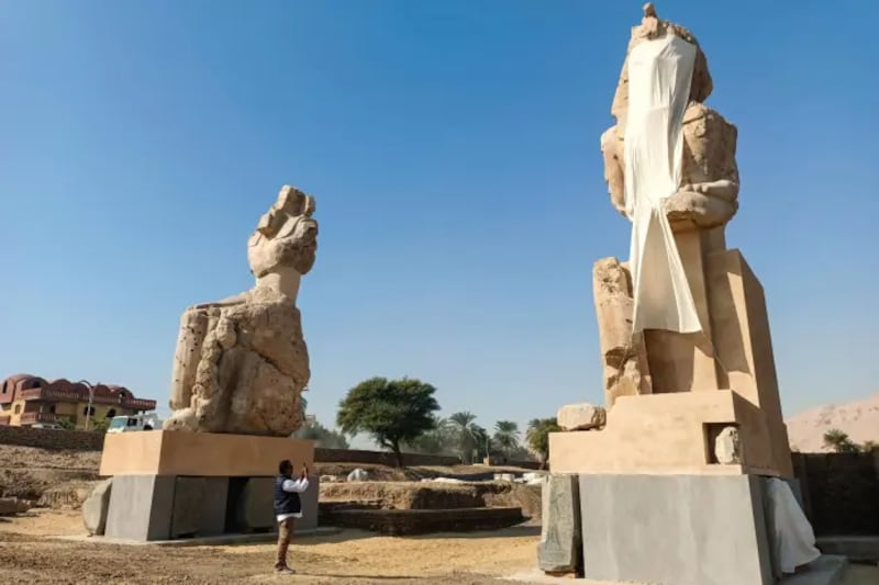 Egipto reveló este domingo dos estatuas colosales de alabastro del rey Amenhotep III, de la dinastía XVIII, tras dos décadas de su restauración y su colocación en su ubicación original, cerca de los famosos colosos de Memnón en Luxor, situada en el sur del país.