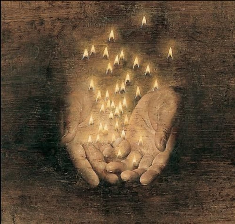 Ante la atónita y pavorosa mirada del develado trío de amorales, y de la maravillada expresión del prelado Soria, el serafín llevó sus manos hacia el frente y juntó las palmas en aquel antiguo mudra orante traído de oriente por Abraham y adoptado por la religión de Cristo, luego de insuflar algo de divino aliento en la cavidad entre ambas palmas, las separó dejando ver pequeñas y flamígeras lucecillas, como si el ángel sostuviese entre su tacto un cúmulo de ingrávidos astros, una constelación. Lux lucet in tenebris, murmuró.
