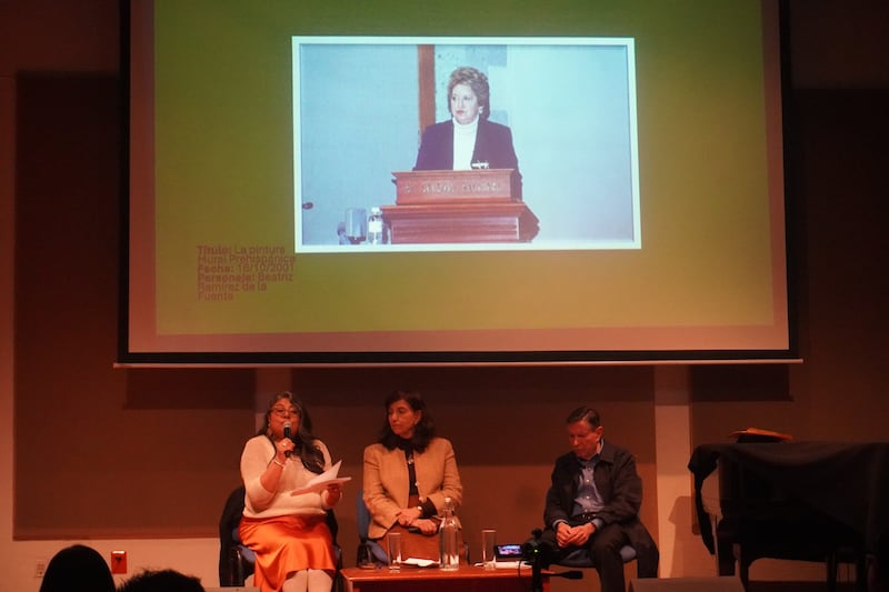 En la penumbra del auditorio se proyecta una fotografía de ese momento: Beatriz de la Fuente, en plano medio, detrás de un atril de caoba. Viste un sobrio saco índigo y una camisa blanca de cuello alto. Lleva el cabello castaño peinado hacia atrás, con volumen. Sus labios rojos parecen desafiar la solemnidad de la ceremonia.
