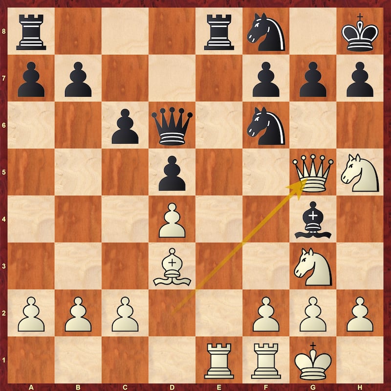 16….Axh5?? (Esos son los errores incomprensibles para el nivel de juego que puede tener un jugador como el primer tablero de Noruega. Con la simple 16….Cxh5 se cambian 4 piezas menores y desaparece el peligro del ataque al rey)