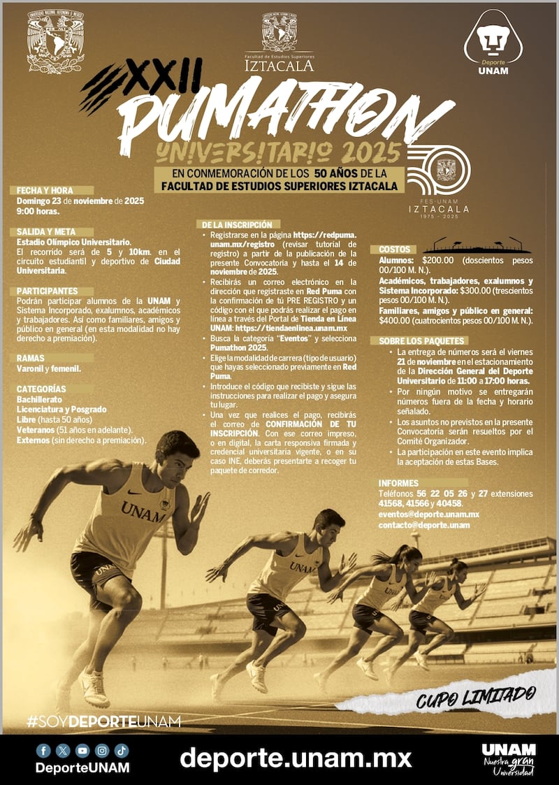 La Universidad Nacional Autónoma de México (UNAM) anunció la realización del PUMATHON Universitario 2025, una carrera conmemorativa por los 50 años de la Facultad de Estudios Superiores (FES) Iztacala. El evento se llevará a cabo el domingo 23 de noviembre a las 9:00 horas, con salida y meta en el Estadio Olímpico Universitario.