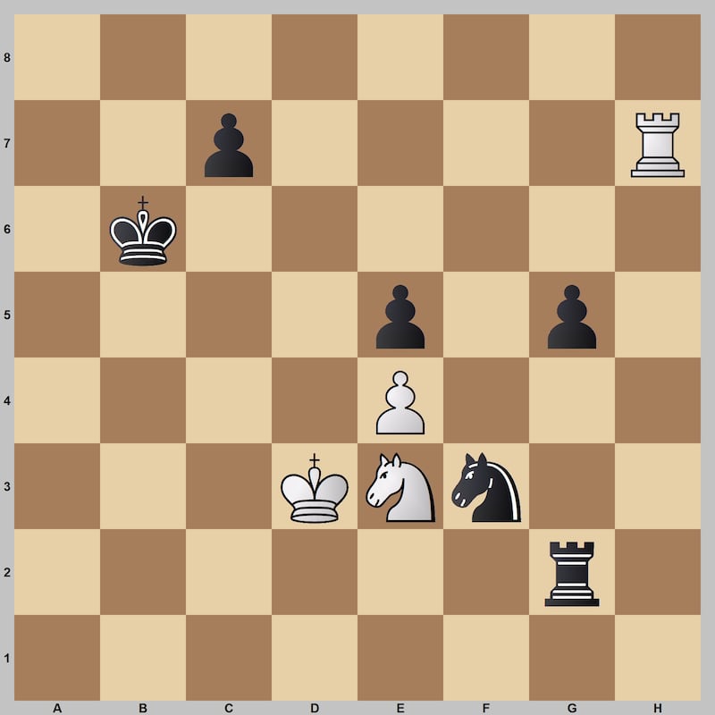 16….Axb3 17.Dxb3 Ce7 18.Tad1 Cg6 19.Cf5 d5 20.c4 dxe4 21.dxe4 Dc6 22.Dc2 Rf8 23.g3 Tad8 24.Td3 Txd3 25.Dxd3 Rg8 26.Cd2 Dd7 27.Dxd7 Cxd7 28.Cb3 Cgf8 29.Td1 f6 30.b5 Rf7 31.Ce3 Tc8 32.Cd5 Re8 33.Cb4 Ce6 34.f3 Ta8 35.Rf2 Cdc5 36.Cxc5 Cxc5 37.Td5 Ce6 38.bxa6 bxa6 39.Re3 g5 40.c5 Tb8 41.Cxa6 Ta8 42.Cb4 Txa5 43.c6 Ta4 44.Tb5 Cd4 45.Tb8+ Re7 46.Cd5+ Rd6 47.Cxf6? Ta3+ 48.Rd2 Cxf3+ 49.Rc2? Rxc6 50.Th8 Ta2+? 51.Rd3 Txh2? 52.Cg4? Tg2 53.Cxh6 Txg3 54.Cf5 Tg2 55.Th7? Rb6? 56.Ce3