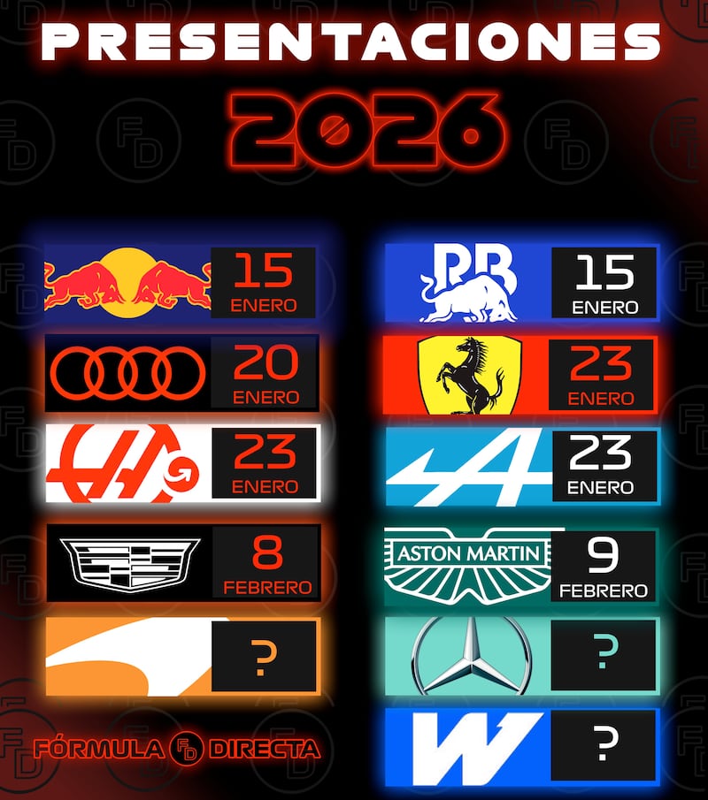 El calendario de presentaciones contempla que Red Bull y Racing Bulls (RB) revelen sus autos el 15 de enero, mientras que Audi lo hará el 20 de enero. Para el 23 de enero, además de Ferrari, también están programadas las presentaciones de Haas y Alpine, lo que convertirá esa semana en una de las más intensas previo al arranque de la temporada.