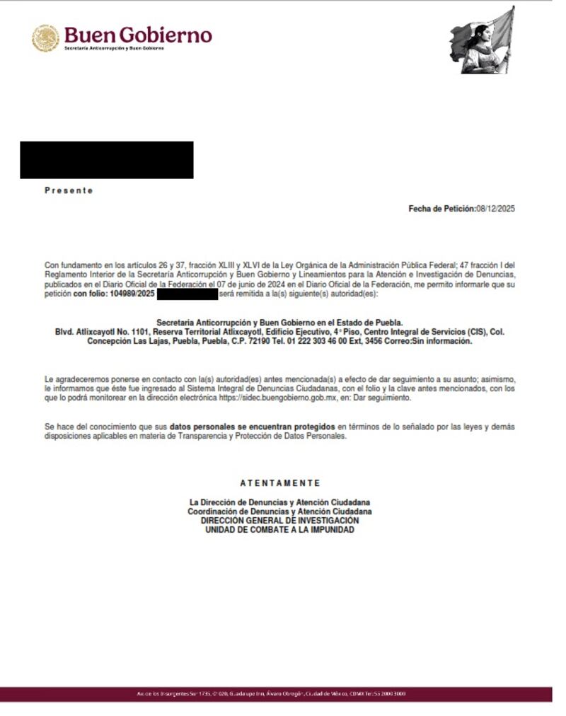 La notificación oficial de la Dirección General de Investigación de la Unidad de Combate a la Impunidad —con fundamento en los artículos 26 y 37, fracciones XLIII y XLVI de la Ley Orgánica de la Administración Pública Federal, así como el artículo 47, fracción I del Reglamento Interior de la Secretaría Anticorrupción y Buen Gobierno y los Lineamientos para la Atención e Investigación de Denuncias publicados el 7 de junio de 2024 en el Diario Oficial de la Federación—, confirma que la documentación será turnada a la Secretaría Anticorrupción y Buen Gobierno en la entidad de Puebla para su análisis.