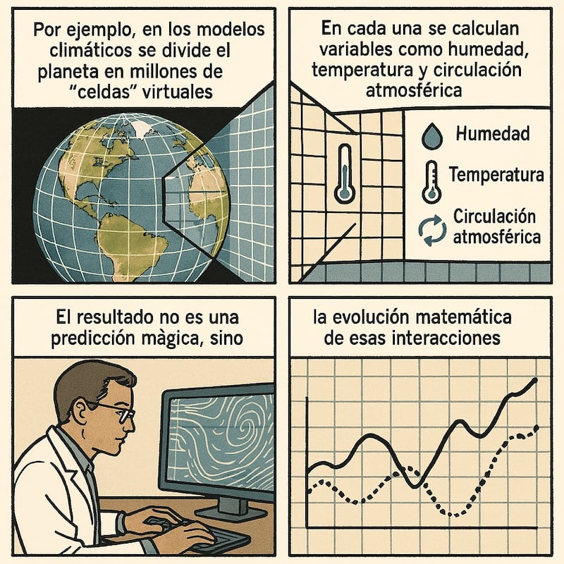Por ejemplo, en los modelos climáticos se divide el planeta en millones de “celdas” virtuales. En cada una se calculan variables como humedad, temperatura y circulación atmosférica. El resultado no es una predicción mágica, sino la evolución matemática de esas interacciones.