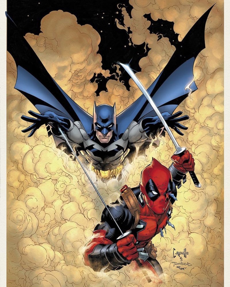 En el primer crossover se enfrentan dos figuras asimétricas, no en habilidades, sino en sus móviles morales, perfiles psicológicos y oficios recurrentes: Batman y Deadpool. El mercenario, dotado de capacidades regenerativas ilimitadas, está de visita —no de placer, sino de trabajo— en Gotham. Irrumpe con toda ilegalidad y espectacularidad en la mansión de Bruce Wayne. El motivo de su allanamiento es interrogar a este multimillonario acerca del paradero de Batman… sin sospechar, ni remotamente, que lo tiene justo enfrente, aunque sin el traje. Bruce, con su característica parquedad, le responde que le resultará difícil dar con él: “Batman se siente cómodo en las sombras; nadie lo encuentra a menos que él quiera”.