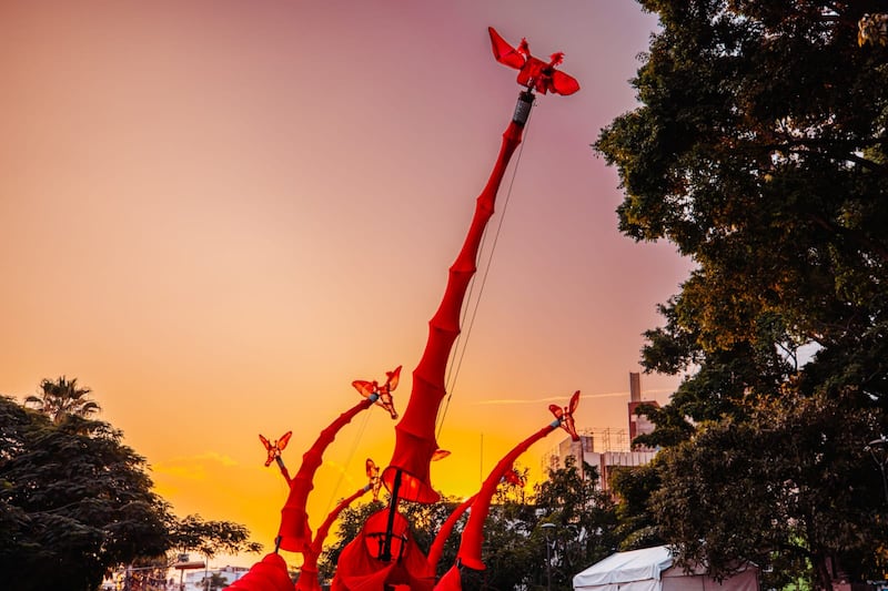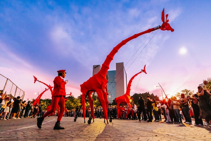 Las siete marionetas de jirafas de ocho metros de altura, animadas por un elenco de compañías locales e internacionales, presentaron una puesta en escena de gran formato. La función inició en La Minerva, donde las jirafas interactuaron con la gente para luego llegar a Los Arcos.