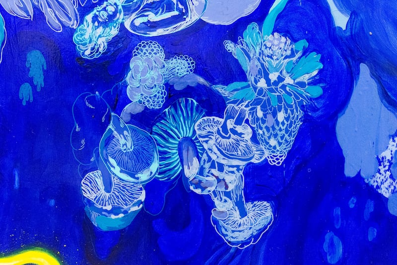 La entrada a la exposición funciona como un portal sensorial que dispone al espectador a la observación pausada de las obras, entre las que se incluyen pinturas y piezas de cerámica, así como fotografías intervenidas y dibujos que revelan algunos de los procesos creativos que derivaron en los trabajos finales.