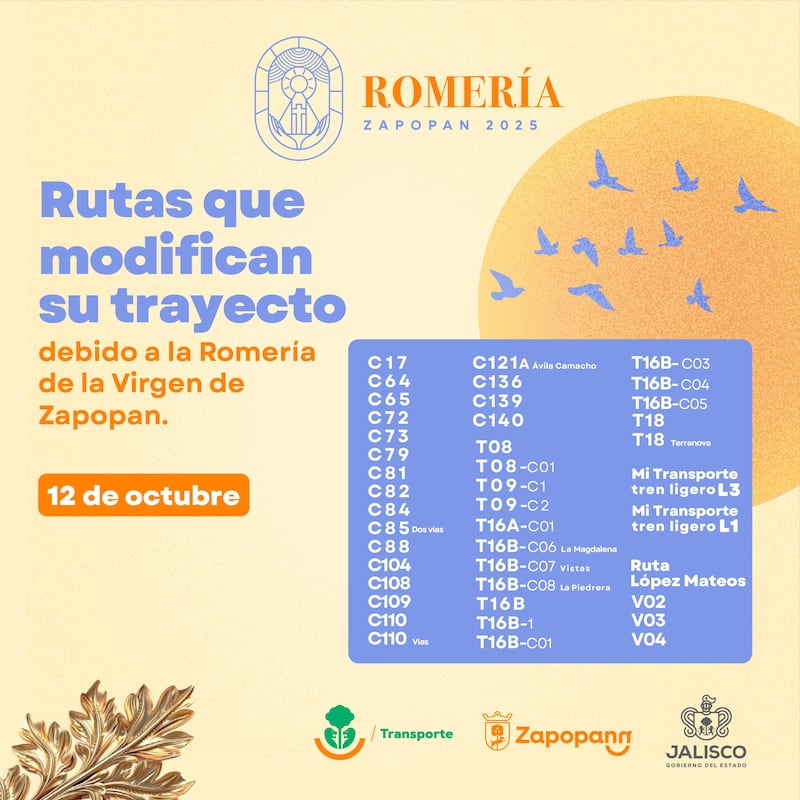 Con motivo de la Romería 2025 de la Virgen de Zapopan, la Secretaría de Transporte (SETRAN) informó que se realizarán ajustes temporales en diversas rutas del transporte público en los municipios de Guadalajara y Zapopan durante el fin de semana.