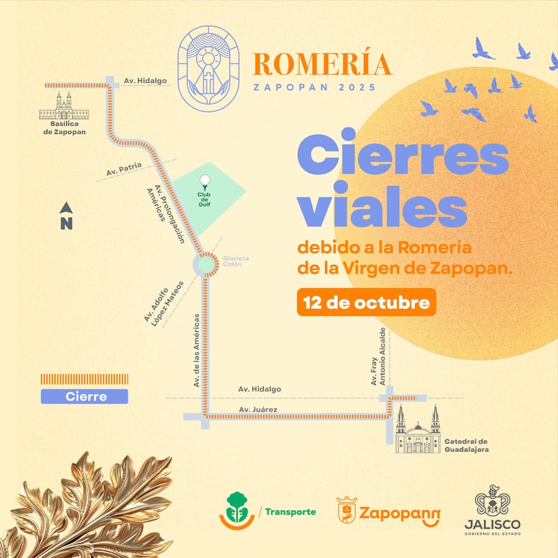 De acuerdo con la dependencia, las modificaciones de derroteros comenzarán la mañana del viernes 11 de octubre en Guadalajara, y a partir de las 18:00 horas en Zapopan, conforme avance el tradicional recorrido de la imagen mariana.