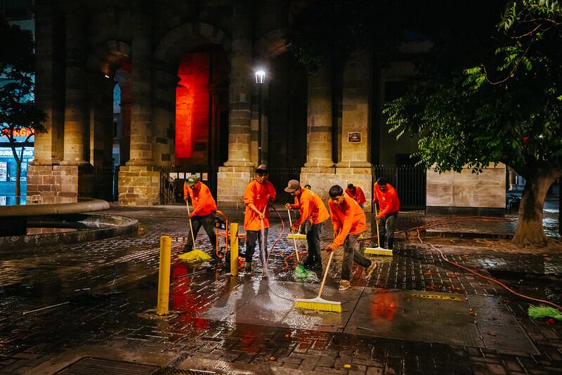 El Gobierno de Guadalajara realizó un operativo nocturno de limpieza en el Centro Histórico con el objetivo de preparar la ciudad para recibir a los miles de fieles que participarán en la Romería de la Virgen de Zapopan 2025.