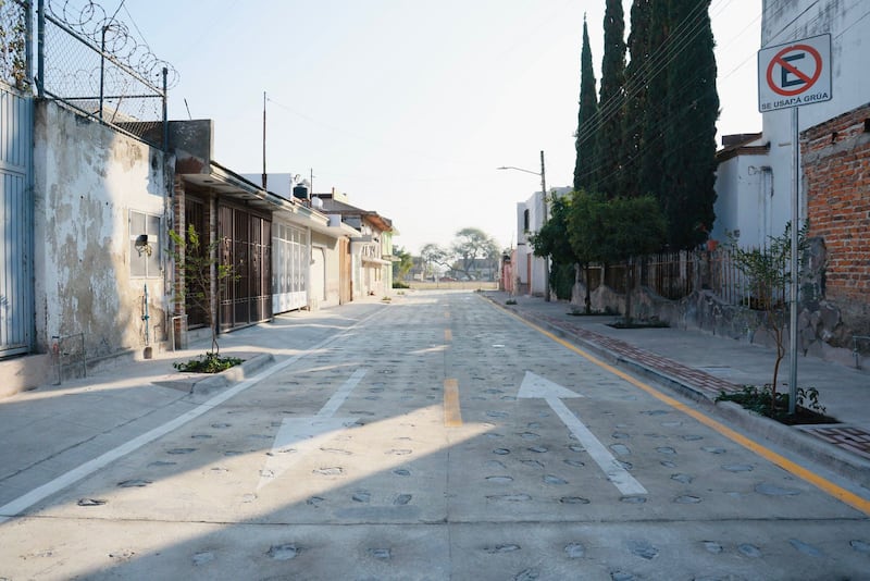“Este circuito entre Ramos Millán e Hidalgo son alrededor de mil 900 metros cuadrados de intervención. Si se fijan, es un empedrado tradicional, pero con concreto; con esto garantizamos la durabilidad, pero también regulamos las velocidades”, detalla.