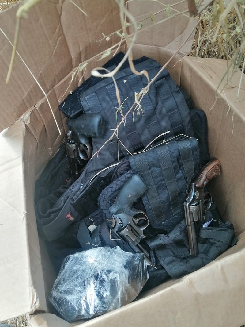 La corporación estatal abundó que junto con el arsenal había seis chalecos balísticos, 10 cargadores de armas de fuego largas calibre .223 y uno más calibre 9 milímetros, todos sin balas.