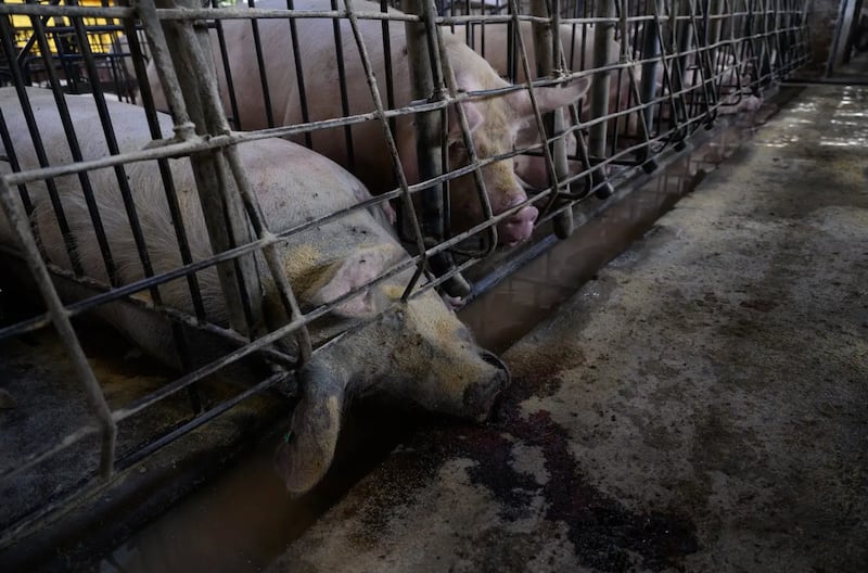 El equipo también registró animales muertos dentro de las jaulas, que posteriormente fueron arrastrados hacia una zanja utilizada como fosa común. Las cerdas, inmovilizadas en jaulas, presentaban conductas estereotípicas, como presionar la cabeza contra las barras y morder el metal, indicativas de un grave deterioro psicológico.