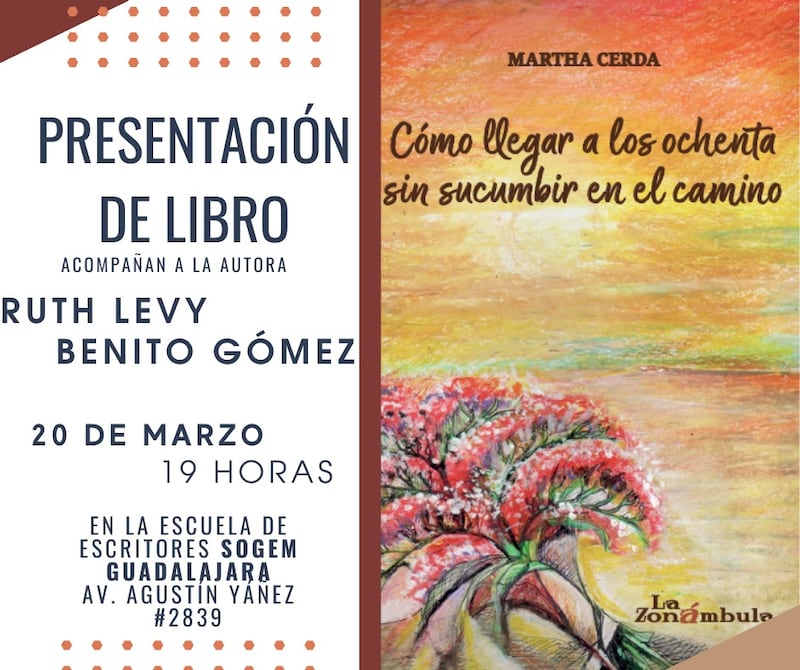 Este próximo viernes 20 de marzo, a las 19:00 horas, tendrá verificativo la presentación del libro “Cómo llegar a los ochenta sin sucumbir en el camino”, de Martha Cerda, en la sede de SOGEM Guadalajara: Avenida Agustín Yáñez número 2839, cerca de La Minerva.