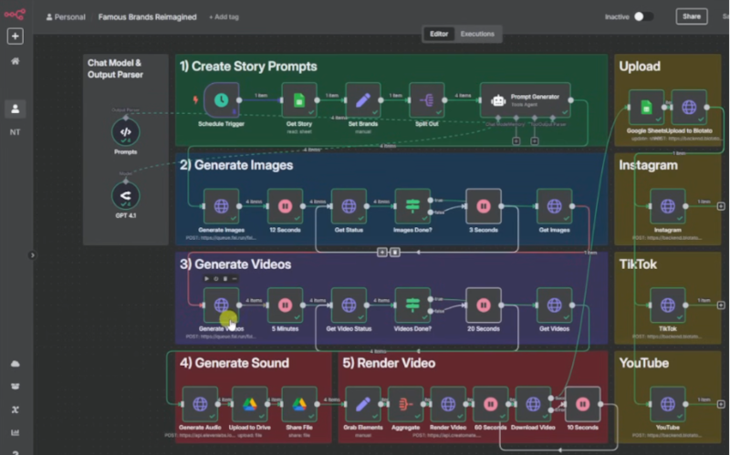 Aquí les muestro un ejemplo de una “máquina” de cortos virales 24/7 en plantilla n8n una IA agéntica que trabaja incluso cuando el usuario se encuentra dormido.