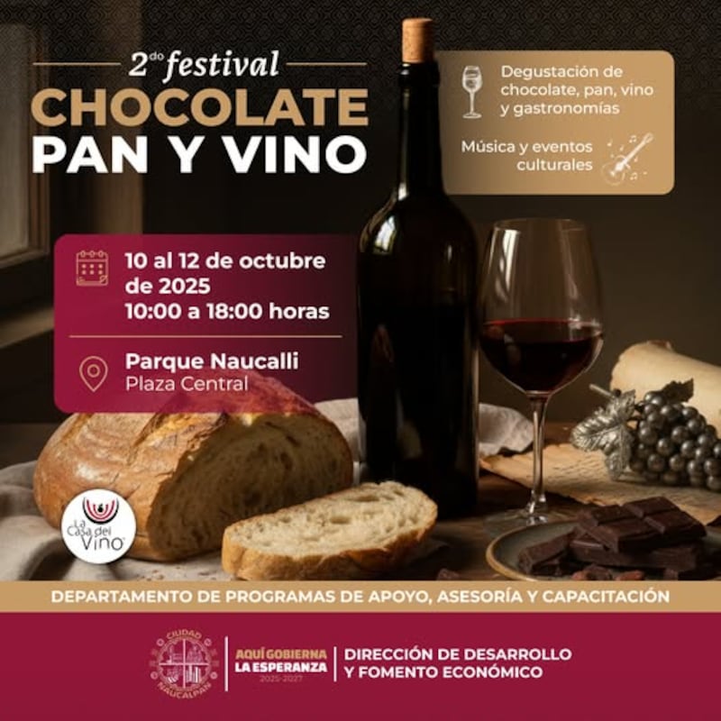 Naucalpan se prepara para recibir uno de los eventos gastronómicos más esperados del año. Del 10 al 12 de octubre, el Parque Naucalli abrirá sus puertas para celebrar el 2º Festival de Chocolate, Pan y Vino, una cita que promete deleitar los sentidos con lo mejor de la repostería artesanal, los productos locales y los vinos nacionales e internacionales, en un ambiente familiar lleno de cultura, arte y música en vivo.