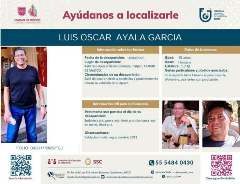 Óscar (48 años) según su madre Lucía García salió a caminar en el Ajusco el 16 de septiembre y no regresó. Su reloj inteligente marcó como última ubicación el eje de Xalatlaco. Desde entonces, la familia ha realizado búsquedas en campo, solicitado el registro de llamadas y acceso a cámaras de vigilancia, sin respuestas claras hasta el momento.