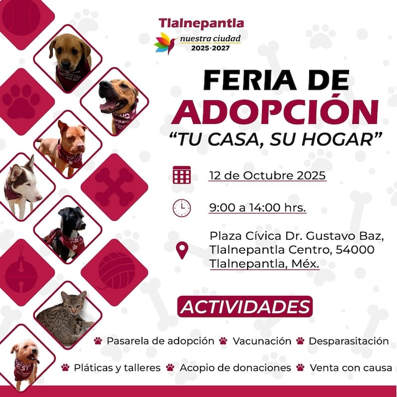 Con el propósito de brindar una segunda oportunidad a perros y gatos en situación de abandono, el Gobierno de Tlalnepantla llevará a cabo la Feria de Adopción “Tu Casa, Su Hogar”, un evento que busca fomentar la tenencia responsable y el amor hacia los animales de compañía. La jornada se realizará el próximo 12 de octubre de 2025, de 9:00 a 14:00 horas, en la Plaza Cívica Dr. Gustavo Baz, ubicada en el corazón de Tlalnepantla Centro.
