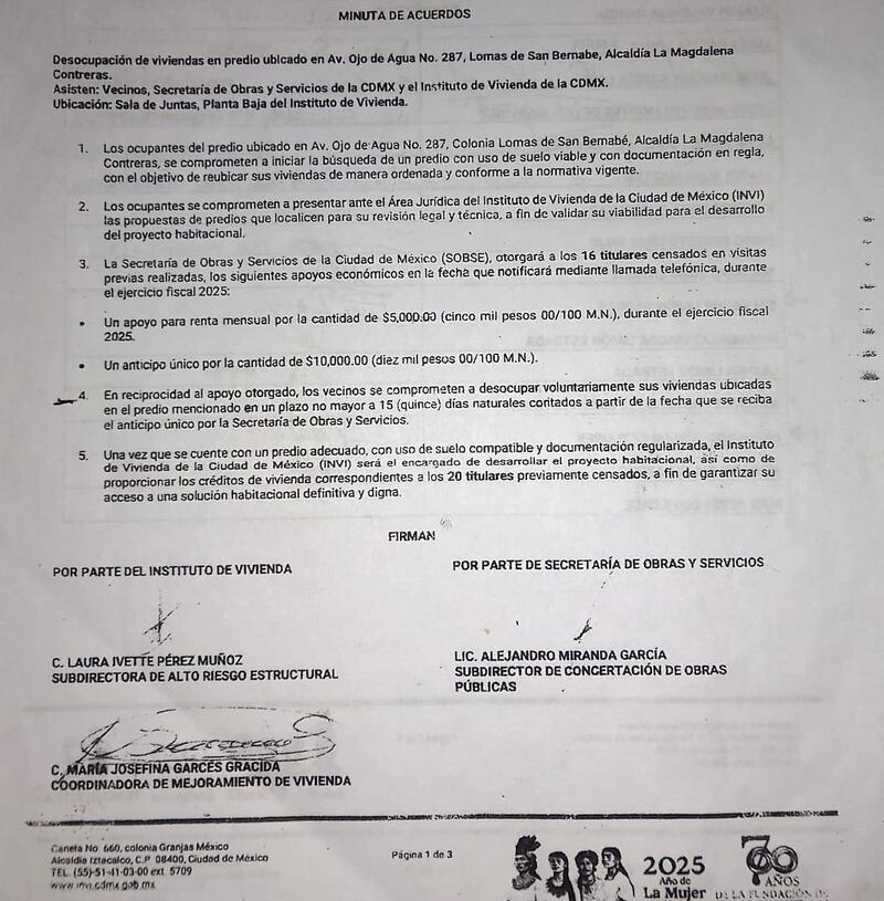 Además fueron obligados a firmar un acuerdo para recibir un bono de 10 mil pesos y un apoyo de 5 mil pesos durante el ejercicio fiscal 2025 para que buscaran una nueva vivienda, montos que nunca llegaron. Aseguran que lo firmaron por temor a represalias.
