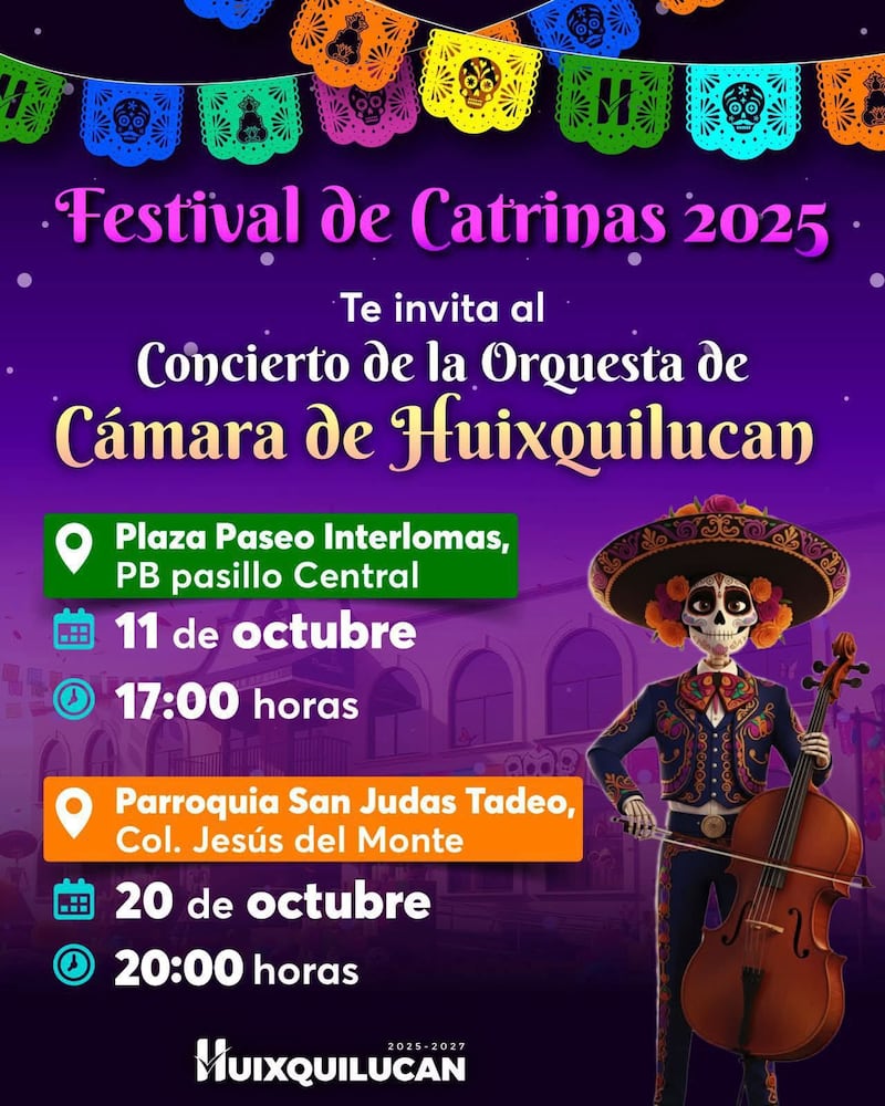 Así que ya lo sabes: si eres amante de la música y las tradiciones mexicanas, no te pierdas los conciertos de la Orquesta de Cámara de Huixquilucan. Vive la magia del “Festival de Catrinas 2025”, una celebración donde el arte, la historia y el orgullo nacional se encuentran al ritmo de las cuerdas, los vientos y la emoción de nuestras raíces.