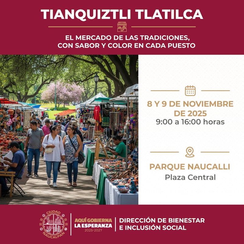 Este 8 y 9 de noviembre, el Parque Naucalli se vestirá de colores, aromas y sonidos tradicionales con la realización del Tianquiztli Tlatilca, un encuentro cultural que busca rescatar las raíces de la comunidad a través del arte, la gastronomía y la creatividad de las y los artesanos locales. Durante dos días, la Plaza Central del Naucalli será sede de una gran muestra artesanal, donde el talento, la identidad y la economía solidaria se unirán para celebrar la riqueza cultural del municipio.