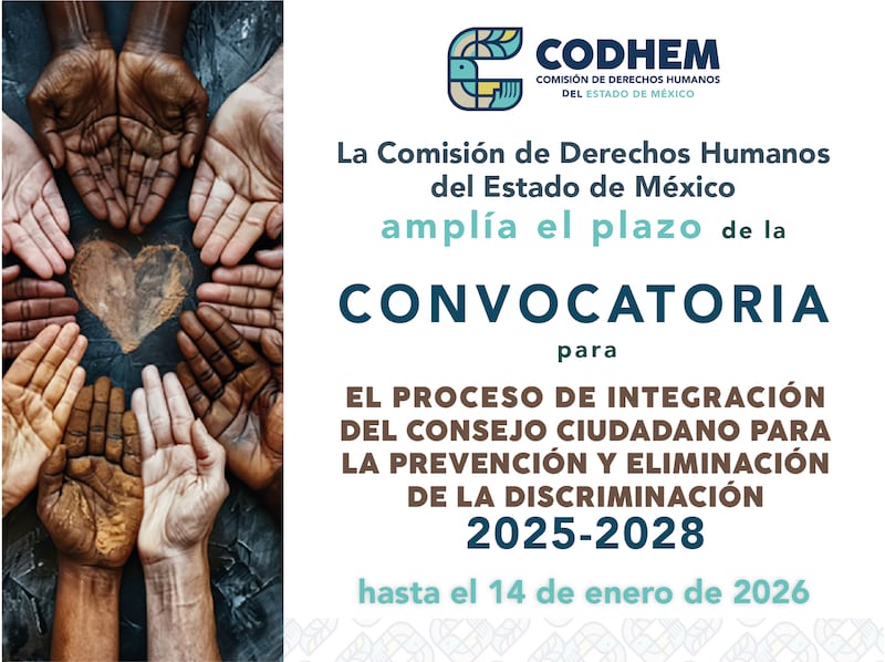La Comisión de Derechos Humanos del Estado de México (CODHEM) lanzó una invitación abierta a las y los habitantes de Huixquilucan para integrarse al Consejo Ciudadano para la Prevención y Eliminación de la Discriminación, que corresponderá al periodo 2025–2028. Con este llamado, la institución busca sumar voces ciudadanas que contribuyan a construir un Estado de México más justo, incluyente y respetuoso de los derechos humanos.