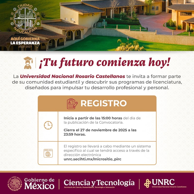 De acuerdo con la información difundida por la institución, el proceso de registro ya está disponible y puede realizarse en línea, lo que facilita la participación de habitantes de Naucalpan que desean iniciar o retomar estudios universitarios. Para consultar los requisitos completos, así como las fechas correspondientes, la UNRC pidió a las y los aspirantes revisar cuidadosamente la imagen informativa publicada en sus canales oficiales y acceder al enlace: unrc.secihti.mx/micrositio_pirc.