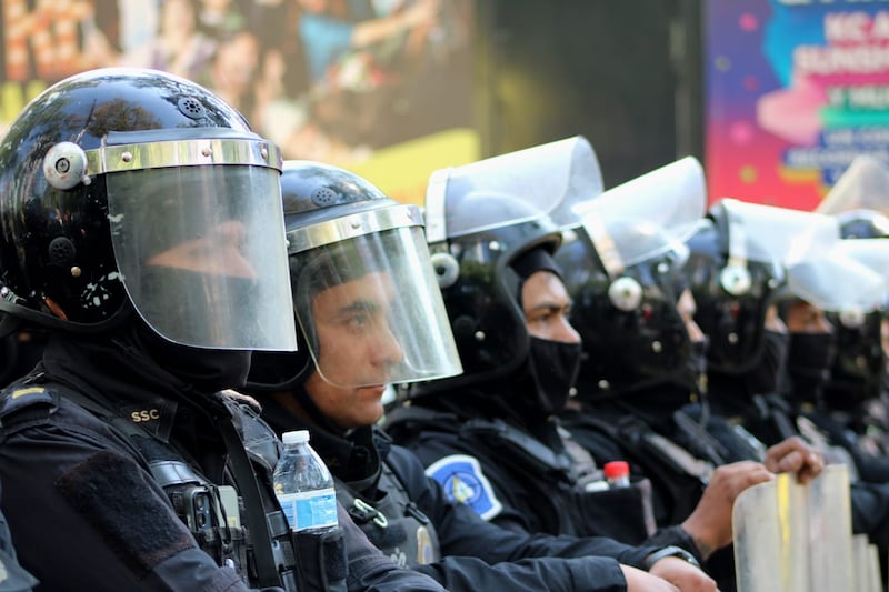 Aunque se trataba de un reducido grupo de personas, no mayor a 200, el grupo de policías metropolitanos impidió el libre tránsito de los manifestantes, primero en el cruce de Paseo de la Reforma y Morelos y después cuando bloquearon de manera definitiva el acceso a la Plaza de la Constitución.