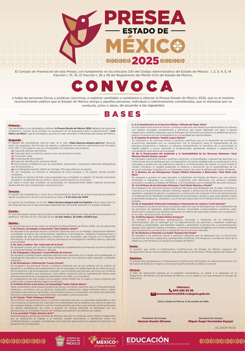 De acuerdo con la convocatoria, el registro permanecerá abierto hasta el 6 de enero de 2026, por lo que se invita a los mexiquenses a inscribir a aquellas personas que consideren ejemplares en su comunidad. Para participar, las y los interesados deberán ingresar al sitio oficial de la presea: https://presea.edugem.gob.mx, donde encontrarán los requisitos, formatos y pasos a seguir para completar la inscripción.