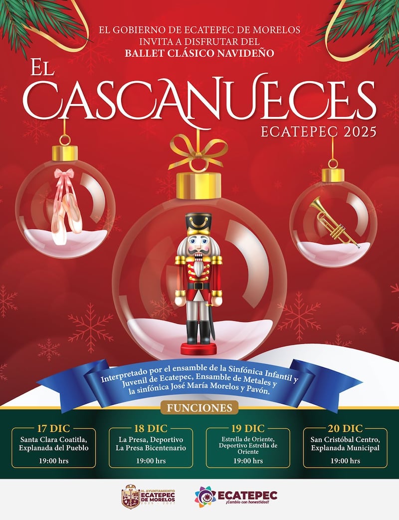 Desde hace varios años, El Cascanueces se ha convertido en una obra representativa de la Navidad alrededor del mundo, conquistando tanto a grandes como a pequeños por su historia fantástica, su música inolvidable y sus coloridos personajes. En esta ocasión, Ecatepec no será la excepción, ya que el municipio ofrecerá un montaje especial en el que participarán diversas escuelas de ballet locales, quienes demostrarán el talento y la formación artística que ha crecido dentro de la región.